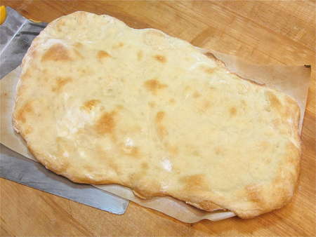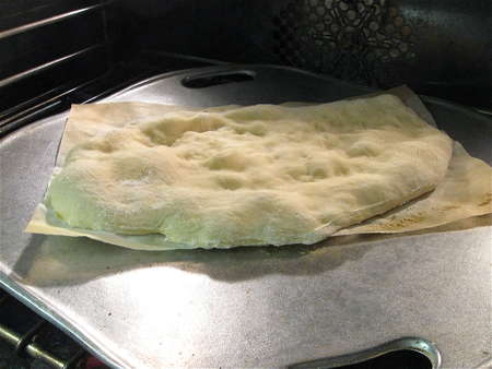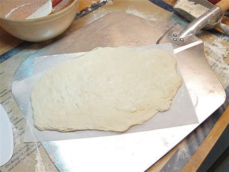 …and was able to press it fairly thin, making a rough oval (about 8” x 12”). My pizza peel came in really handy here.