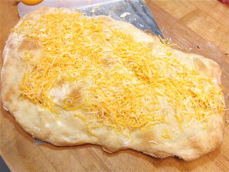 First, a layer of cheese. I like to lay down a base of cheese and then cover it with the other stuff, as cheese is more likely to char than many other types of topping.