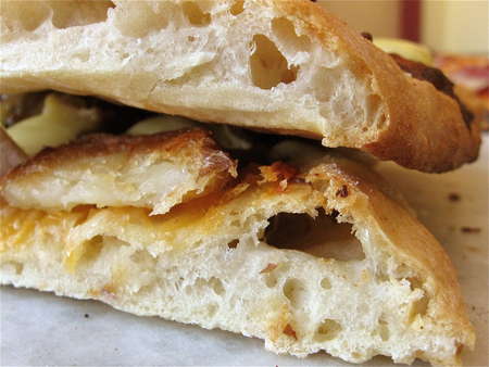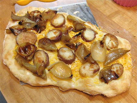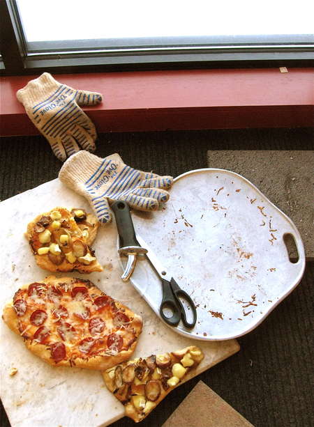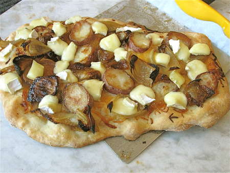 Eight minutes later, roasted potato, onion, and Brie pizza. I added the chunks of Brie in the final minute or so of baking. See, I can be chic when I want to!