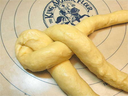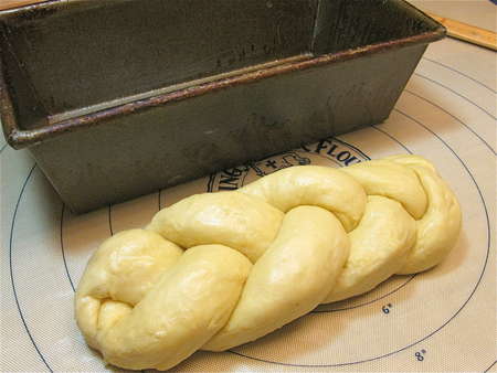 Continue until you’ve made a braid. Tuck the ends underneath. Repeat with the other half of the dough.