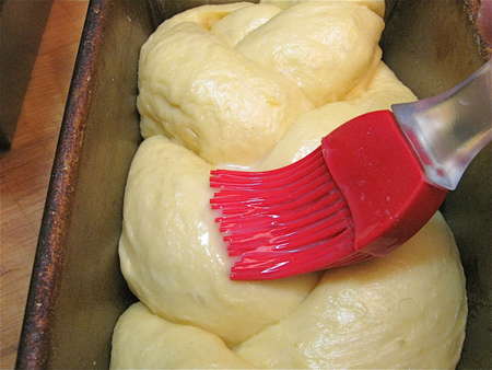 Brush the dough with an egg white mixed with 1 tablespoon of milk. A silicone pastry brush does a nice, gentle job.