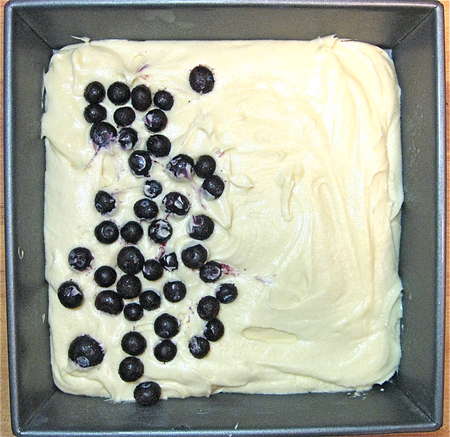 If you like, scatter blueberries (fresh or frozen) on top. (I was experimenting here, so only put the berries on half the cake.) Put the cake in a preheated 325°F oven, and let it begin baking as you make the crumb topping.