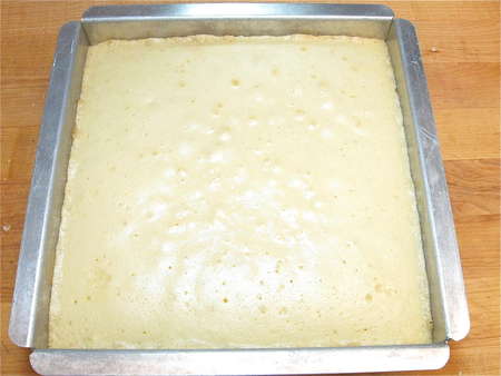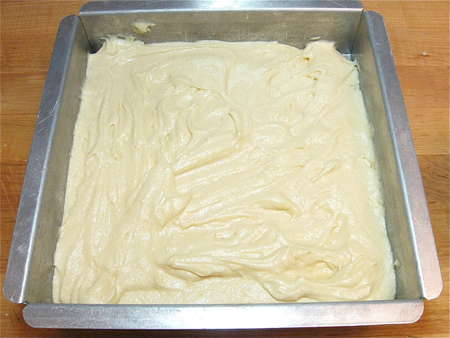 When the cake has baked for 30 minutes, remove it from the oven. You'll see that it's barely set; handle it carefully. Note that this isn't the cake with the blueberries; it's a later version. You'd be surprised how many times we might bake a recipe for these blog posts; we always seem to have some new experiment we want to try.