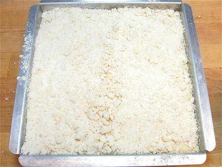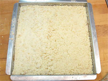 Sprinkle the crumb topping over the surface of the cake. (See that faint vertical line down the center? I was doing another experiment, to see if melting the butter for the topping was a good idea. I decided it was.)