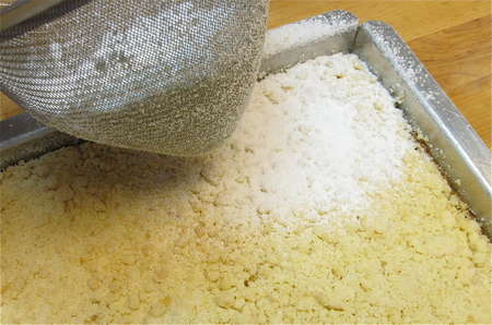 When the cake is completely cool, sprinkle heavily with confectioners' sugar. I'm running it through a sieve here, which makes a nice, even layer of sugar.