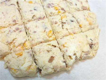 Then stack the slices, and cut them in sticks. Turn the sticks 90°, and cut them into cubes. Does it matter how big you make the cubes? No. Clearly you don't want huge 1” chunks in your scones, but don't fuss too much; 3/8” to 1/2” is a nice size.