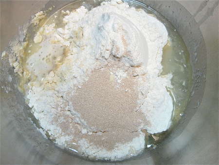 We're going to take one of my very favorite easy bread recipes—Blitz Bread—and turn it into soft, fat breadsticks. To start, everything goes into a mixing bowl: water and olive oil; salt, King Arthur Unbleached All-Purpose Flour, and instant yeast. Plus Pizza Dough Flavor; not a must-have, but a wanna-have for sure.