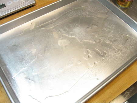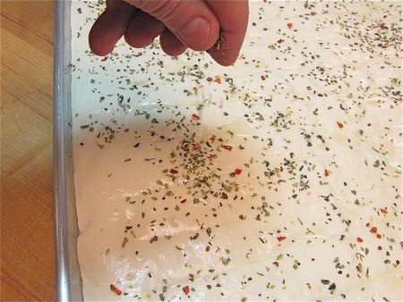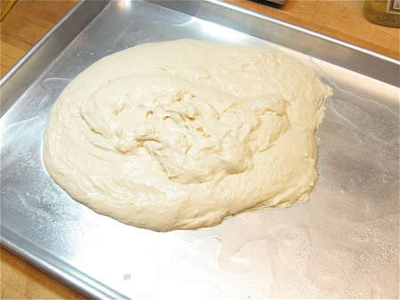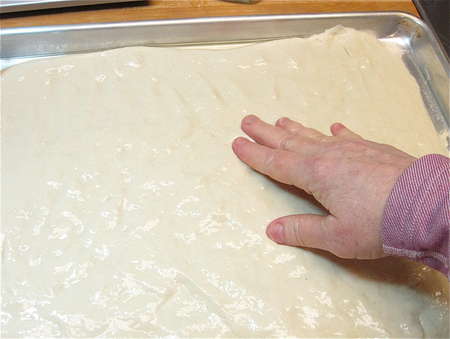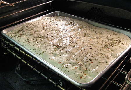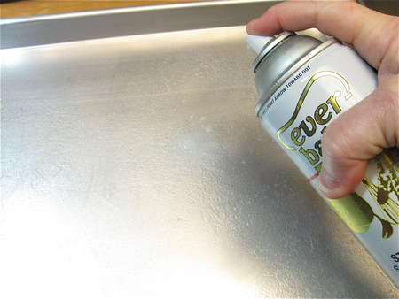The recipe calls for you to bake this bread in a 9” x 13” pan. Instead, I'm using a half-sheet (18” x 13”) pan, in order to make a thinner bread, more suitable for cutting crosswise into breadsticks. First we're going to spray the pan with non-stick vegetable oil spray (as usual, I grab the EverBake)...