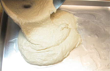 “Flow” the dough into the pan. Yes, it really is this sticky.