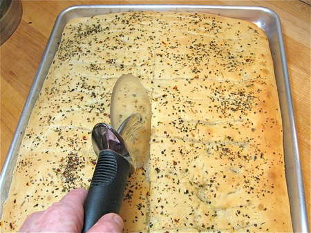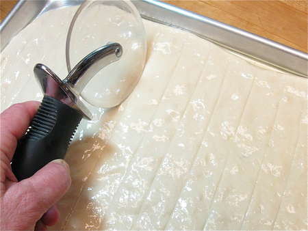So I thought, how about if I score the bread to make breadsticks? So I grabbed my favorite pizza wheel, and scored the dough crosswise in 1” strips.