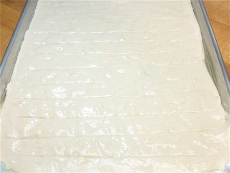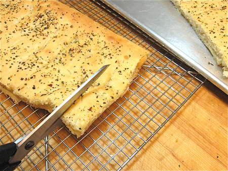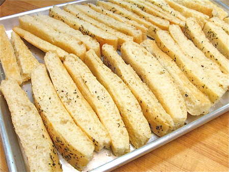 Put the strips back on the pan, and bake in a 350°F oven till the sticks are as crunchy as you like. For just a tiny bit of outer-crust crunchiness, and complete softness inside, bake for only about 5 to 8 minutes. Bake longer for crunchier sticks. How long? Up to you. This bread is so easy to make, it doesn't matter if the sticks aren't exactly the way you like them first time around. they'll still be totally delicious; and you can amend your baking time next time around.