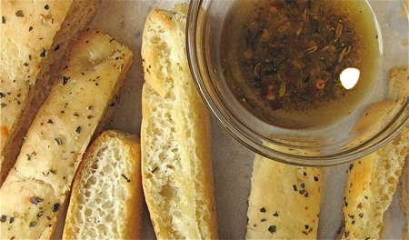 But wait—there's more. We're dipping our breadsticks, you and I, in a really compelling flavored olive oil. Maybe extra-virgin olive oil packed with freshly crushed garlic. Or one of John Boyajian's imaginative dipping oils (below). Maybe even bagna cauda... And if you've never enjoyed this cream, garlic, butter, and anchovy dip, served warm in its own little fondue pot—I tell you, Mr. Man, you have yet to experience Heaven on earth.