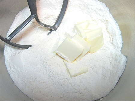 These sconelets start like any other scone recipe; in fact, the recipe I use here is for our Guaranteed Scones. Whisk together King Arthur Unbleached All-Purpose Flour, sugar, salt, and baking powder. Add cold butter, cut in pats.