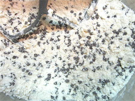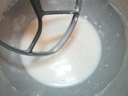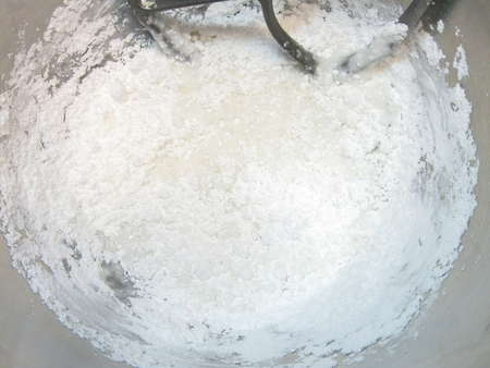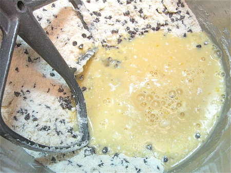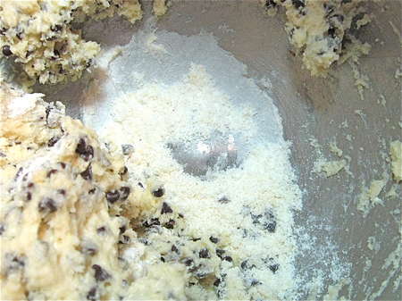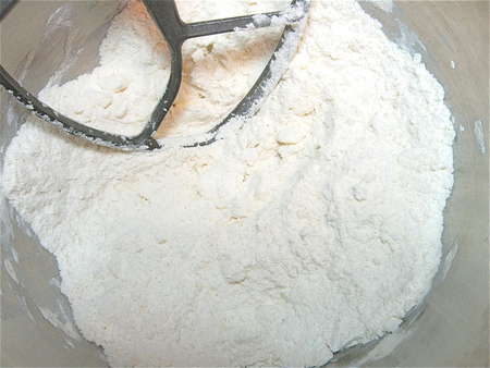 Mix just to combine. Inevitably, there'll be some flour left in the bottom of the bowl; use a plastic scraper or spatula to work it in.