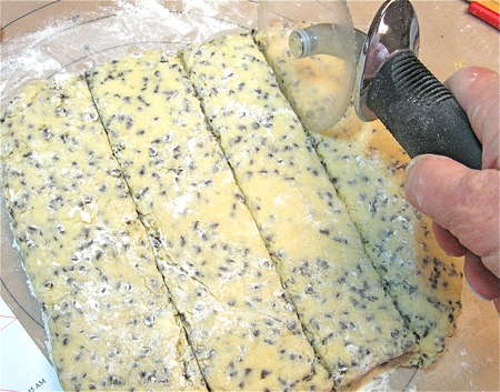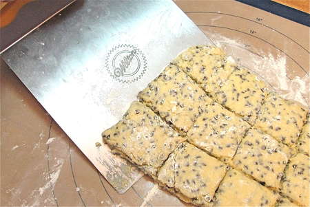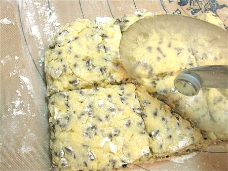 After making these initial cuts, lift the scones and sprinkle more flour underneath. You want to make sure you'll be able to get them off the mat and onto the pan, once they're cut. Hint: If you do this all on floured parchment instead of a silicone mat, you can simply drag the parchment onto a half-sheet pan, and separate the tiny scones once they're cut, right on the parchment/pan.