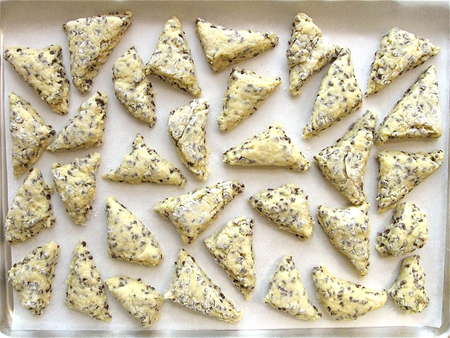 Next step: making 64 tiny scones out of 32 medium scones. Cut each triangle in half.