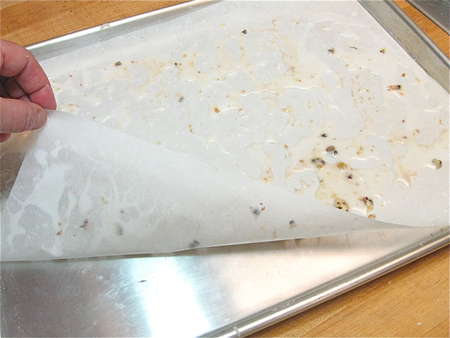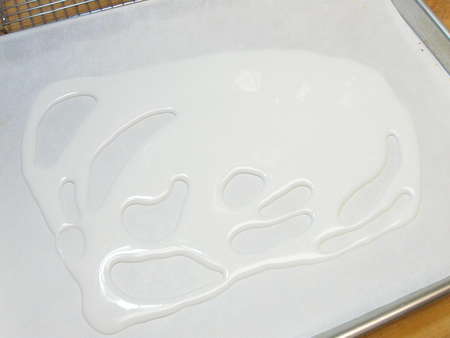 Get out your handy parchment and put a piece into a pan with sides. Pour about half the glaze into the pan.