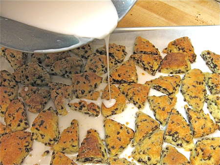 Set the scones in the glaze, moving them around a bit to distribute the glaze.