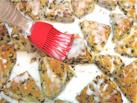 Use a pastry brush to cover each scone with a coating of glaze. This is easier than it might look; the glaze is very thin and spreads easily.