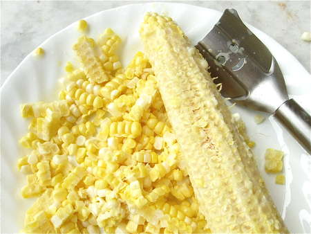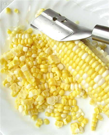Fresh corn: ah, summer's sweet pleasure... I'm using a "corn zipper" here to peel off the kernels, quick as a wink and totally undamaged.
