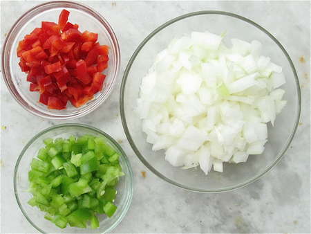 Next, peppers and onions, chopped. Does wielding a knife around an onion send tears coursing down your cheeks? Try our onion goggles—another gadget that really works.