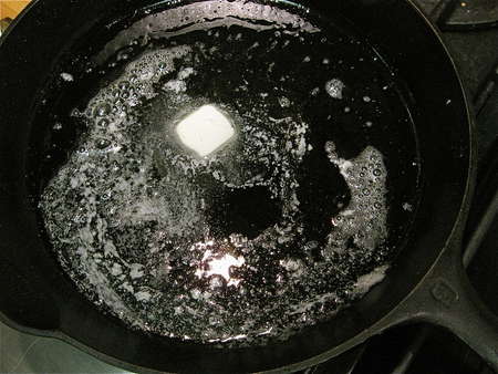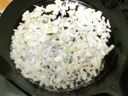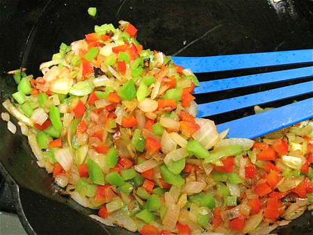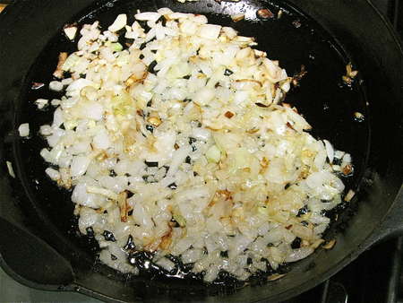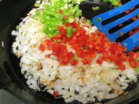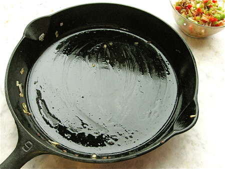 Remove the veggies from the skillet. Yeah, it LOOKS greased. But trust me—grease it again, using non-stick vegetable oil pan spray.