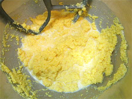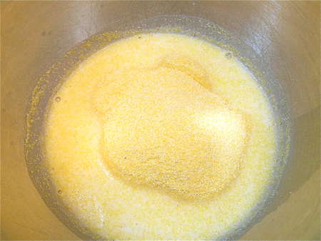 OK, we're finally ready to make the batter. First, we'll stir together cornmeal and milk.