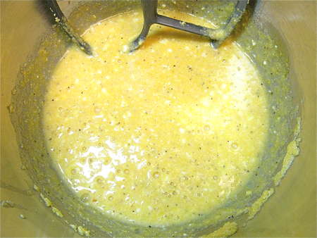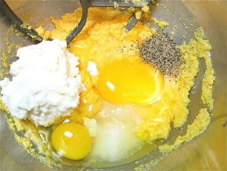 Once we add the sugar, cottage cheese, eggs, salt, pepper, and baking powder...