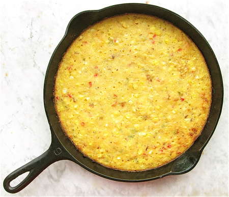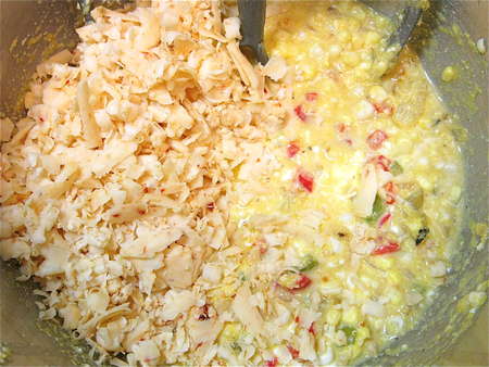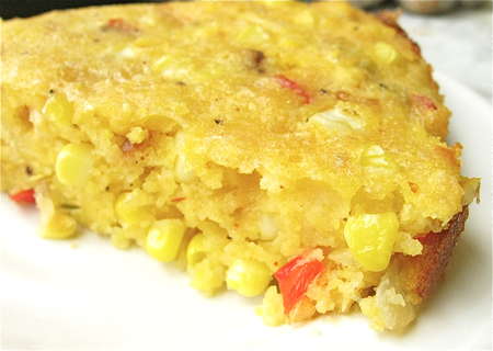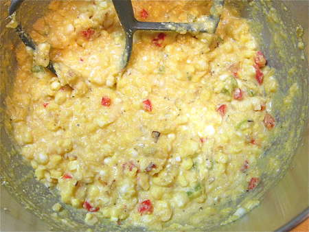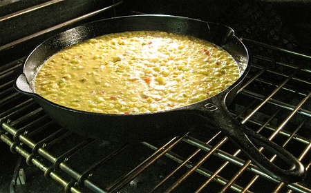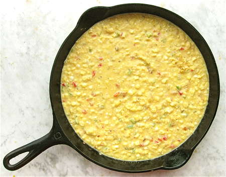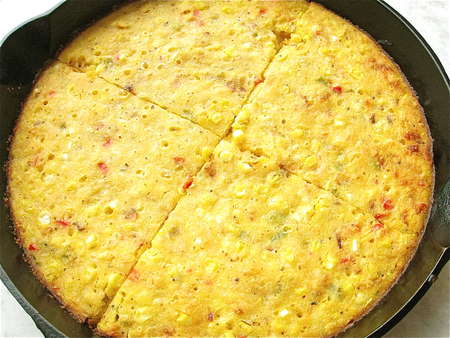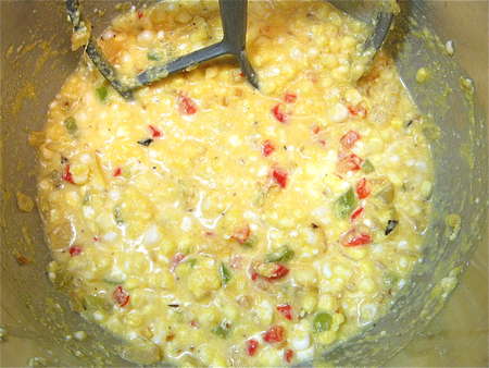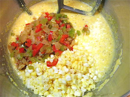The recipe revealed all: Milk, eggs, cornmeal, cottage cheese, and baking powder mixed into batter. Fried onions, red and green peppers, jack cheese, and corn kernels—fresh off the cob—stirred in. A touch of sugar, and a hint of salt and pepper to enhance the flavors. BINGO—cornbread to write home about.