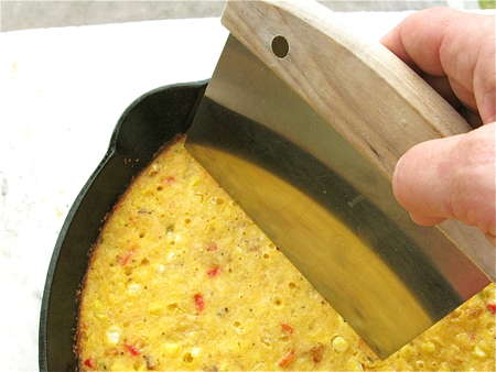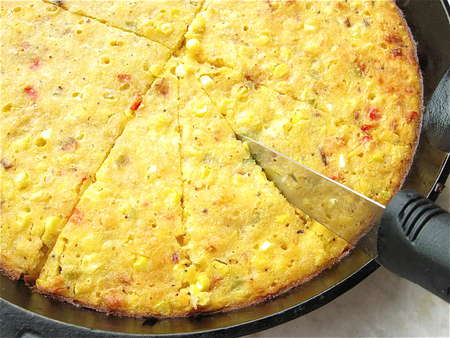 I let it cool but briefly, then cut a piece and lifted it out of the pan. Make that tried to lift it out; I had to scrape it off the bottom. Let that be a lesson to me (and you): just because you fried vegetables in your cast iron skillet, it doesn't mean you don't have to grease it when baking cornbread.