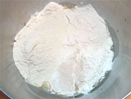 As with almost all yeast breads, we'll start by putting all of the ingredients into a bowl. We recently received a comment here on the blog asking that all of the ingredient amounts be listed; that way, if you use your laptop in the kitchen, you won't have to toggle between the recipe and the blog. Good suggestion! So here's what goes in the bowl: