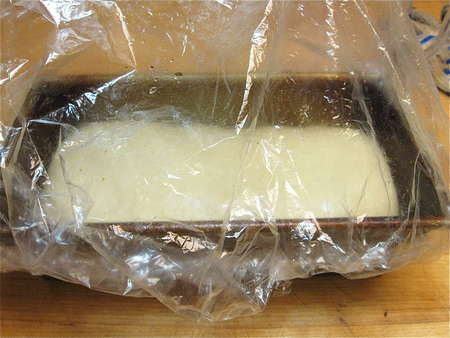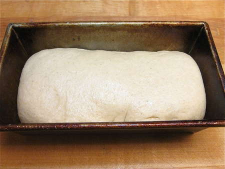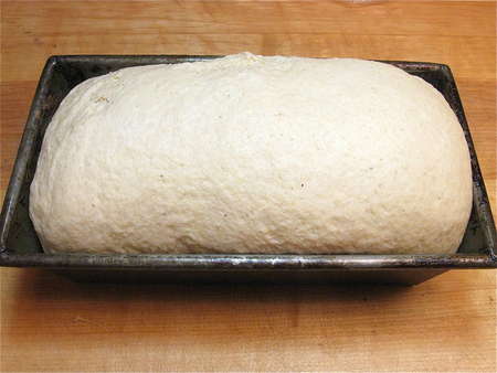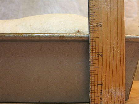 It's hard to see from this angle, but the loaf should have risen about 1” over the rim of the pan. You can let it get a bit higher, if you like; the loaf doesn't have much oven-spring (i.e., it won't rise a lot more once it goes into the oven).