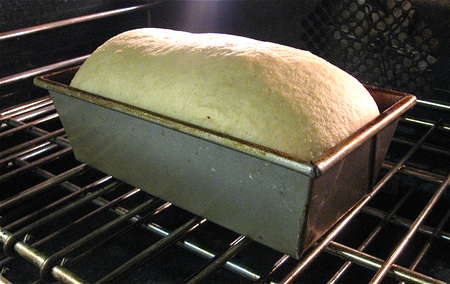 An hour or so later, the bread has risen nicely. Actually, whether it was the barometric pressure or what, I found this bread was a really quick riser. It only took 30 minutes for it to rise this much when I tested it on a stormy June afternoon.