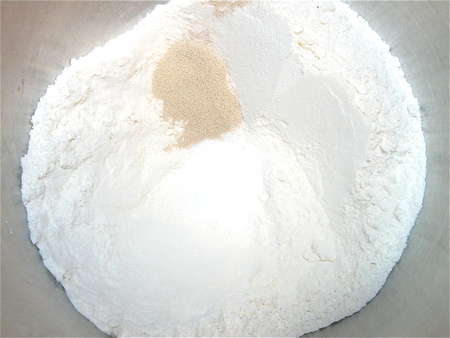 Combine the flour with 1 tablespoon of regular salt (or 1 1/2 tablespoons kosher salt); and 1 tablespoon of instant yeast.