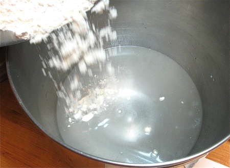 Put 3 cups (24 ounces) of lukewarm water in a mixing bowl, and add the dry ingredients.