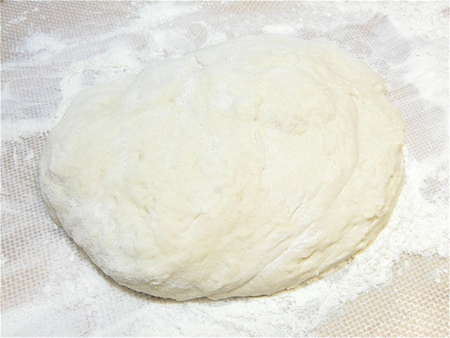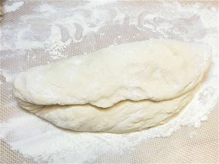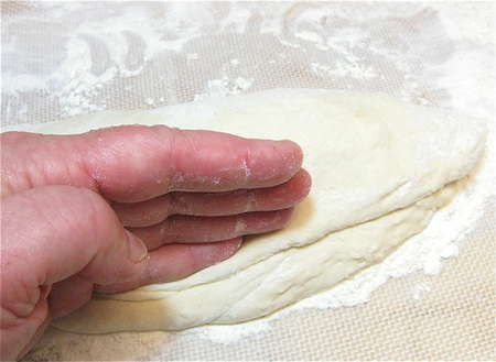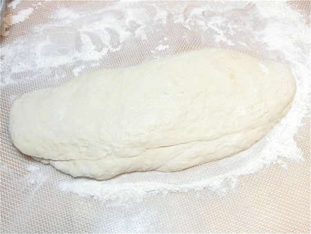 Place the dough on a very well floured surface, and shape it into a rough oval. I'm using our silicone mat here; it makes cleanup easy.