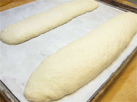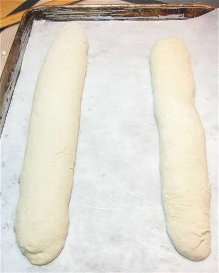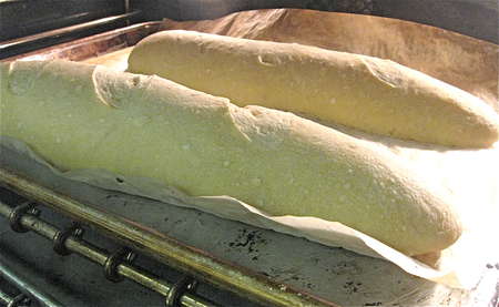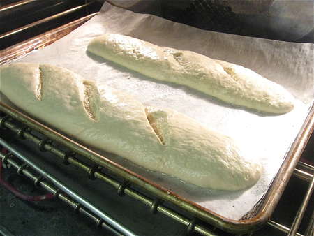 Let the baguette(s) rise, covered, for about 90 minutes. They should get pretty puffy. Don't worry if they spread outwards rather than up – they'll ”pick up” when they hit the oven.