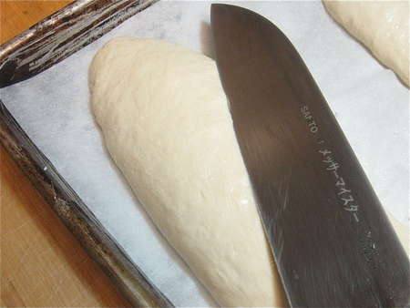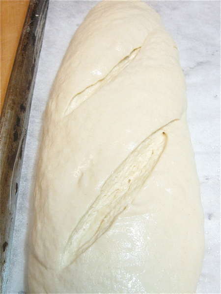 The cuts should be fairly deep. Your baguette(s) will start to deflate. Don't panic! Quickly spritz with warm water, and get them into that hot oven.