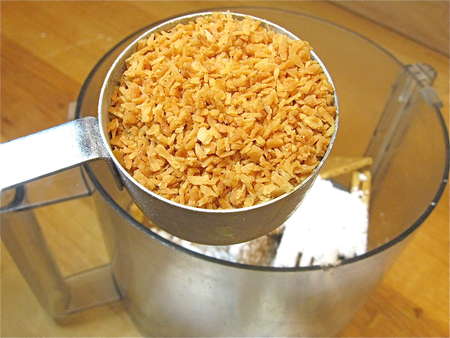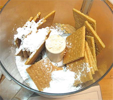 Put the crackers into your food processor with 1/4 cup (28g) confectioners’ sugar, and 1/8 teaspoon salt.