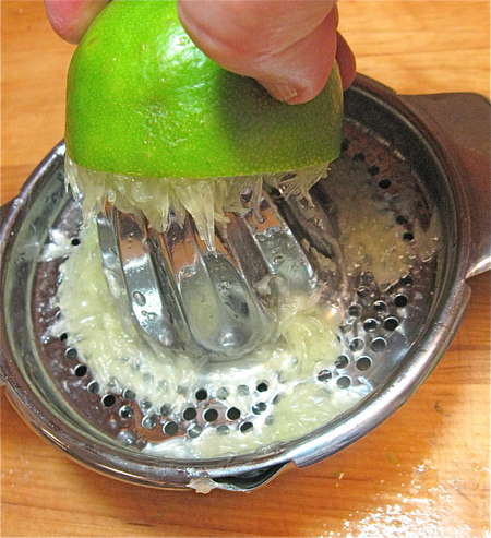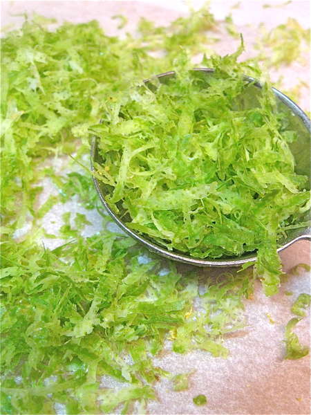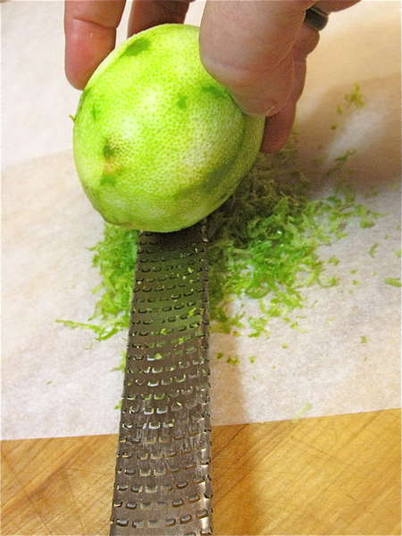 Before you squeeze the juice out of all the limes, shred the peel off one of them. I'm using a microplane zester here; it works very well indeed. Microplane definitely makes sharp, efficient graters.