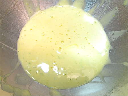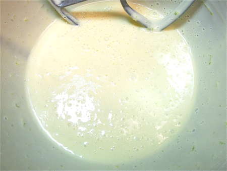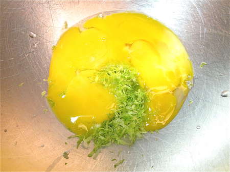 Whisk the zest and egg yolks at high speed of an electric mixer for about 4 minutes. The mixture will lighten in color and thicken somewhat, looking kind of like Hollandaise sauce.