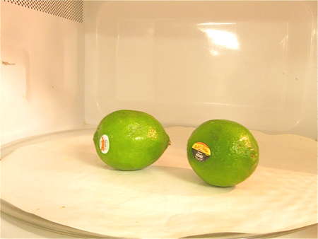 WHAT are these limes doing in the microwave? Rumor has it that heating them briefly softens their interior membranes, allowing them to release more juice.