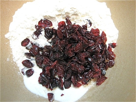 Add 1 teaspoon baking powder, 1/2 teaspoon baking soda, and 1 cup (113g) dried cranberries. Whisk to combine.