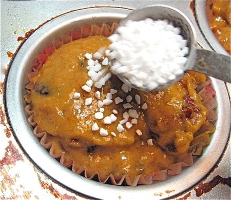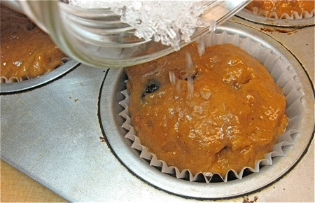 Here's the sparkling sugar going on – right out of the jar. I usually don't bother to measure; just sprinkle till the top of each muffin is completely coated.