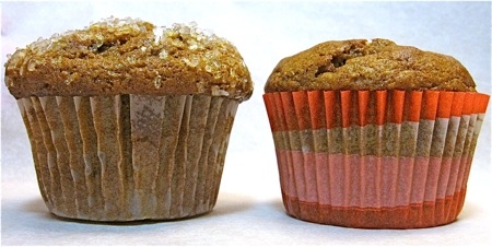 Here's what happens if you don't give the muffin batter a rest prior to baking. The taller, “rested batter” muffin is on the left; non-rested on the right. The rest both softens the Flav-R-Bites, if you use them; and gives the baking powder and baking soda a chance to get going.