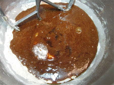 Combine 1/4 cup (85g) molasses, 2 large eggs, 1 1/3 cups (283g) brown sugar, and 4 tablespoons (57g) melted butter.