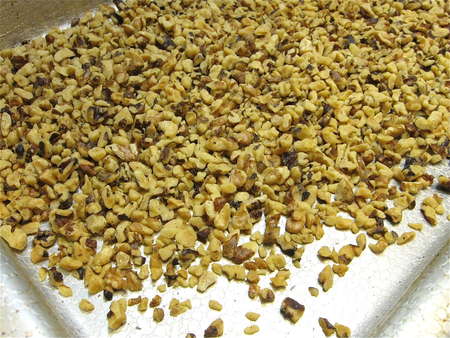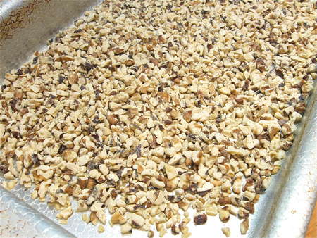 Let's begin by toasting 2 cups (227g) of chopped walnuts. Here's what they look like going into a 350°F oven...