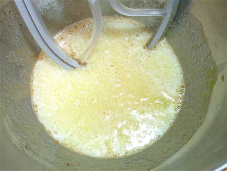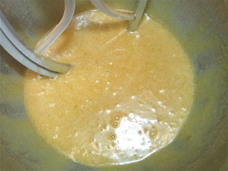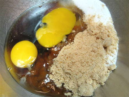Mix together, then pour 5 tablespoons (75g) melted butter on top. Why did I add the butter after the other ingredients had already been mixed up? Because I didn't want to pour the hot butter over the eggs, for fear it might cook them a bit.