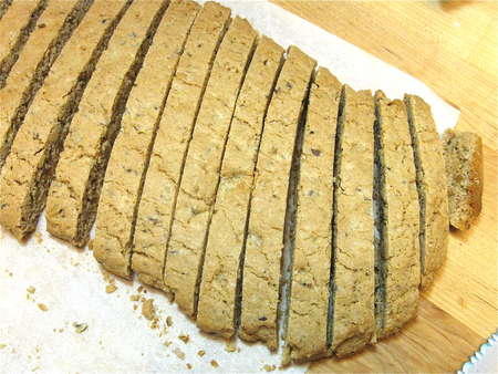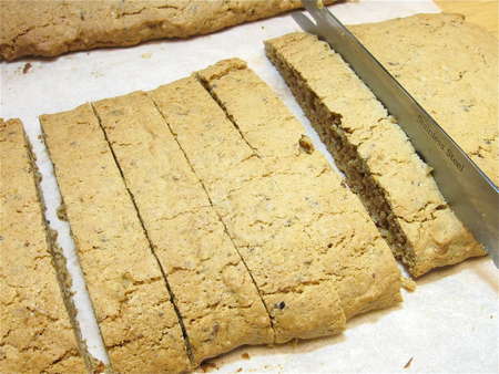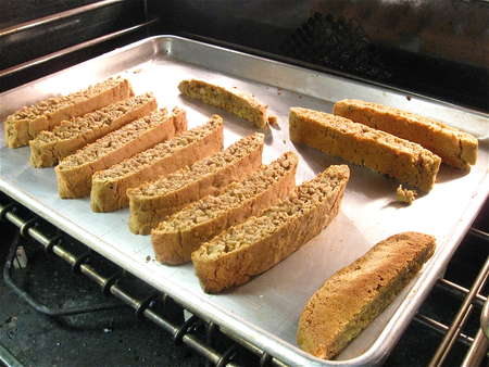 The recipe said to lay the slices on the baking sheet cut-side down. Bake for 12 minutes, turn over, and bake for an additional 12 minutes, till browned. I did that; but the resulting biscotti were, to my taste, too thick and clunky. So I reverted to my usual biscotti method...