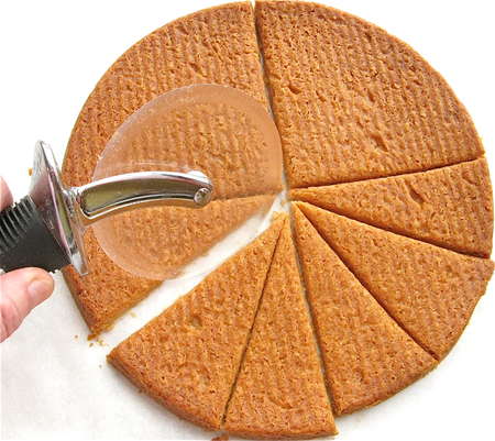 Turn the shortbread out of the pan, and quickly cut it into wedges. Don't let it cool; it's difficult to cut without crumbling when it's fully cooled.